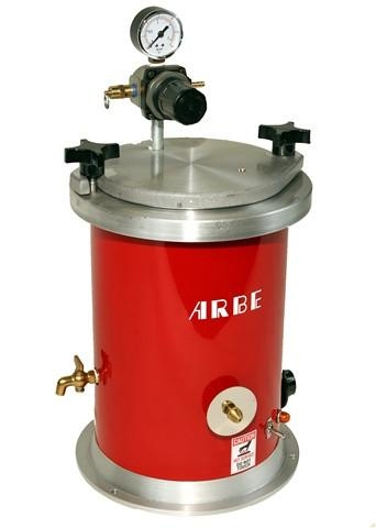 4-Quart Air Pressure Wax Injector. Our largest capacity air pressure wax injector for manufacturers and others who shoot more waxes. Has a liquid filled high sensitive thermostat for accurate temperature control, a wax drain spigot and a mount for using an optional thermometer for double-checking temperature. A separate air compressor is required to operate this wax injector. Unit has a 10 inch diameter footprint and stands 18 inches high.