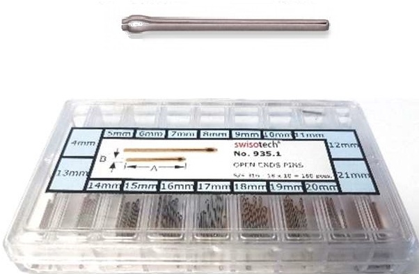 Assorted open end pins for watches ranging from 0.4mm to 21mm.