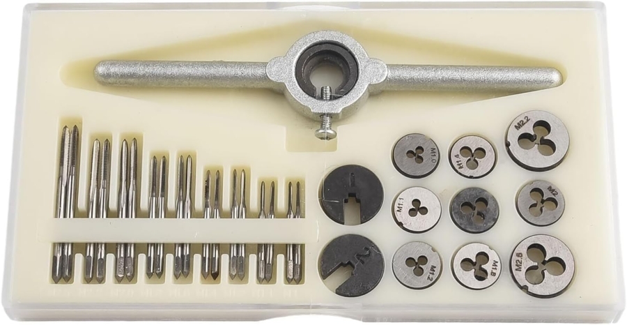 This Set of Screw Dies HSS and Taps HSS is a compact 31-piece metric tapping tool kit designed for creating and repairing tiny internal threads from M1 to M2.5. It includes a range of high-speed steel taps, dies, tap holders, and a wrench to give you everything you need for precision threading in model building, watchmaking, electronics, and small engineering projects. Sized for very fine metric threads, this set makes it easy to cut or re-cut threads in metals, plastics, and soft materials with accuracy and durability.