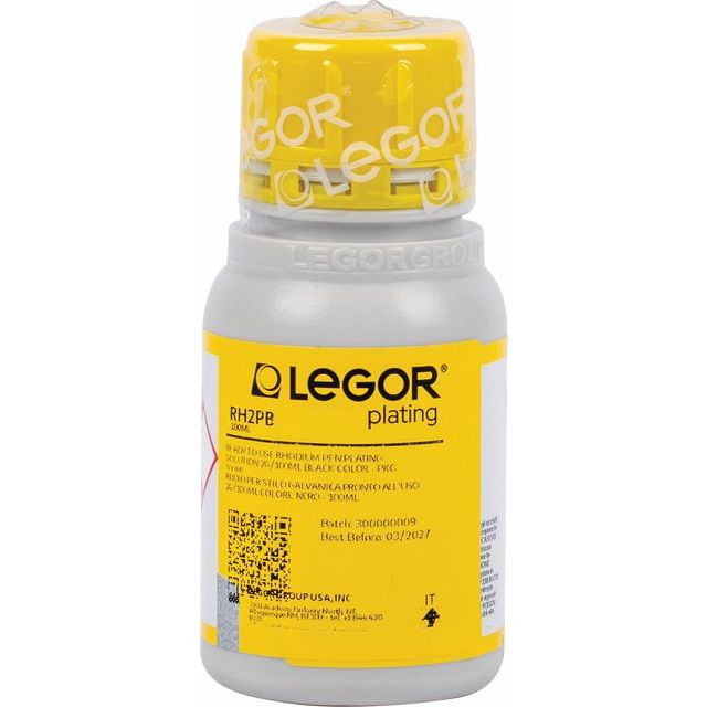 Highly concentrated, this Legor® RH2PB black rhodium pen-plating solution delivers an ultra-dark black color with consistent tone and thickness across the entire workpiece. Ideal for creating two-tone designs, for use with black inlay and for plating prongs to highlight black diamonds. The formula is completely free of arsenic, both in the metal deposited and in the solution itself. This 25ml jar contains 0.5g rhodium.