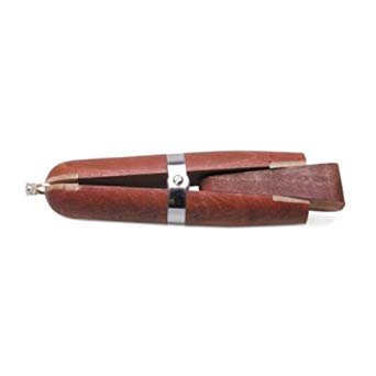Handy tool for holding rings to be filed or polished and for general ring work. Made of fine polished mahogany with round and flat leather lined jaws. Includes wooden wedge.