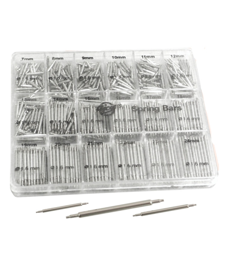 An assortment of double-ended spring bars available in sizes ranging from 7mm to 24mm. The set is neatly organized in a clear storage case with labeled compartments, allowing for quick and easy size identification.