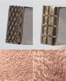 Texturing hammers for non-ferrous metals. This double-sided hammer enables the user to make attractive patterns to give jewelry and other metal items a special look. Just place sheet metal on a flat metal block or anvil and strike sharply. In no time you will have interesting patterns. Hammers have a Rockwell hardness of 48 and the more the hammer is used the more interesting the patterns become.